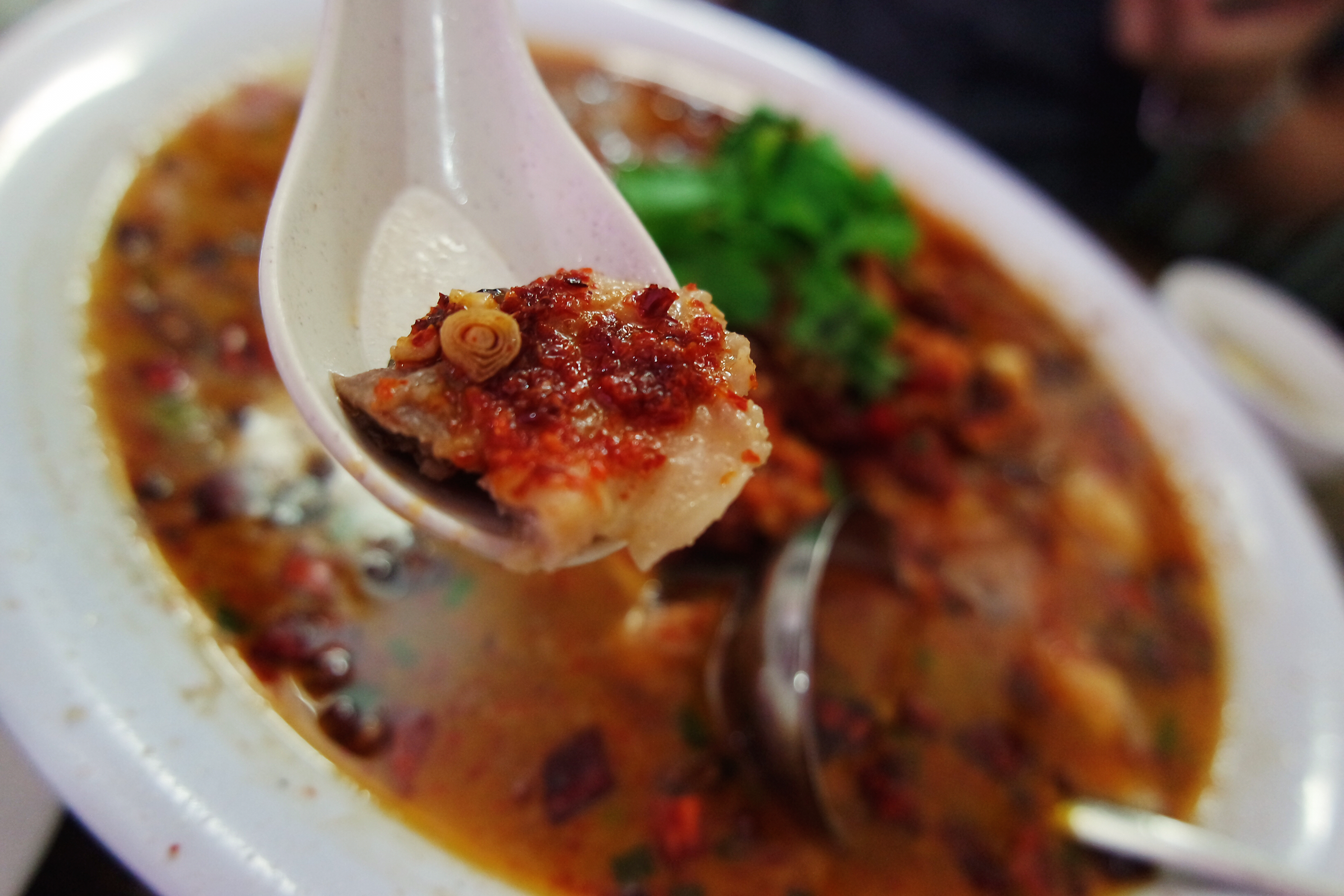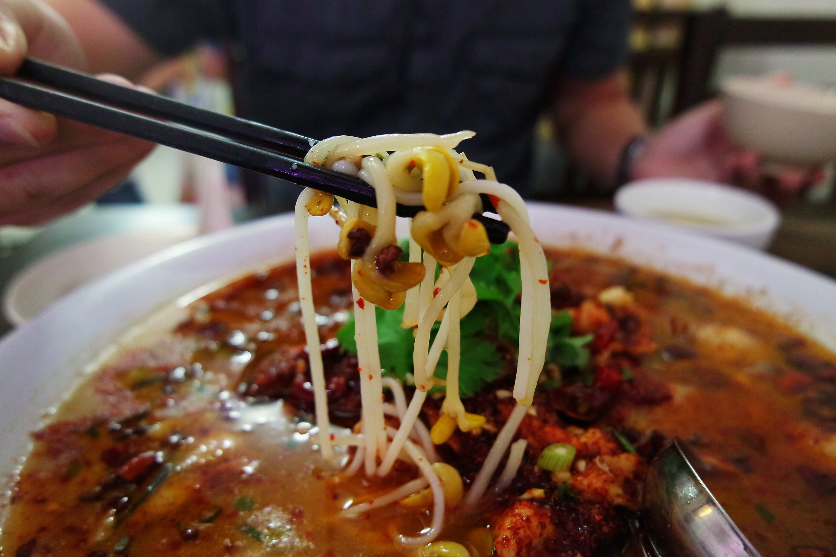 其實,我吃了很多年,也問了老闆好多次,到底這裡的水煮魚是使用什麼魚片的,但是也從來問不出一個所以然。但是魚片滑溜順口,加上魚肉已經被仔細片了出來,肉歸肉,刺歸刺,吃起來很方便~ 魚片的下方躺著一小丘的大豆芽和粗米線,是小套餐的概念嗎?而這一大堆食材淋上辣高湯,再被澆上滾燙辣油、灑上辣椒粉、辣椒片、花椒、生蒜等等,口味之重自然不言而喻。當然,吃湘菜就是要吃這種口味有層次的。